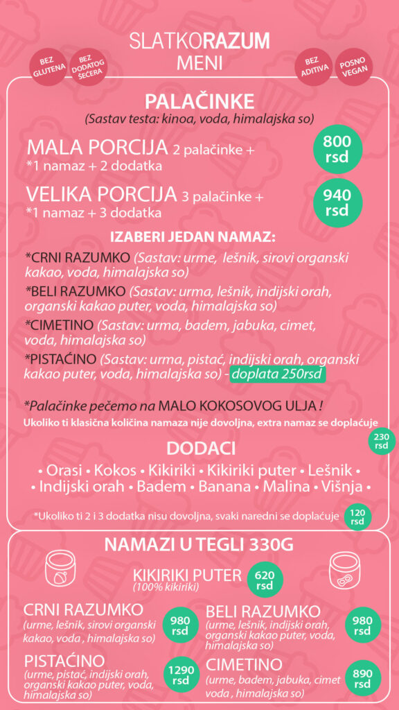 ZdravoRazum MENI Meni sa NAJČISTIJIM SASTAVOM u gradu! *Ni jedan proizvod ne sadrži dodati šećer, gluten, laktozu, ne sadrži industrijske sastojke! Poruči ONLINE Poruči ONLINE Poruči ONLINE Poruči ONLINE Poruči ONLINE Poruči ONLINE